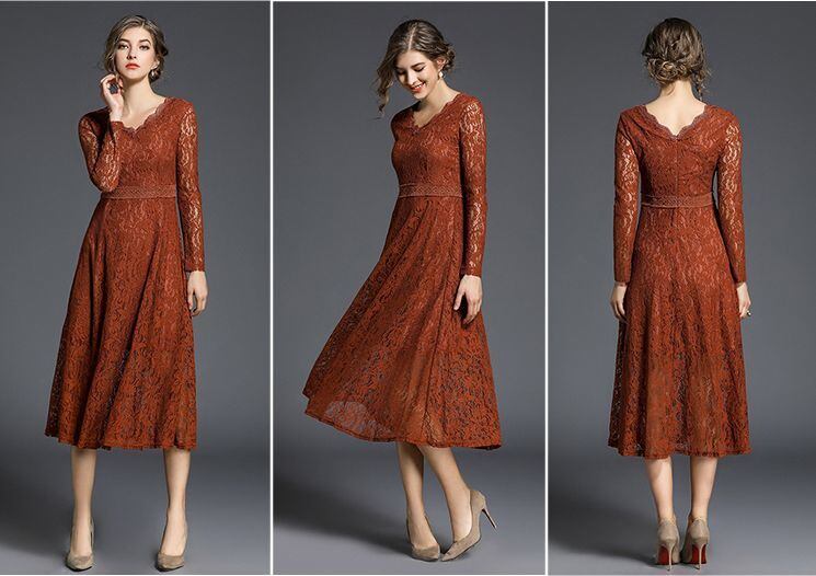 繊細レースに、深めのVネックが洗練された印象の、ロングワンピース。