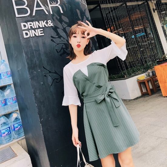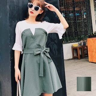 ビスチェ風ウエストリボンストライプ柄ワンピースデートや女子会にFKOM8665