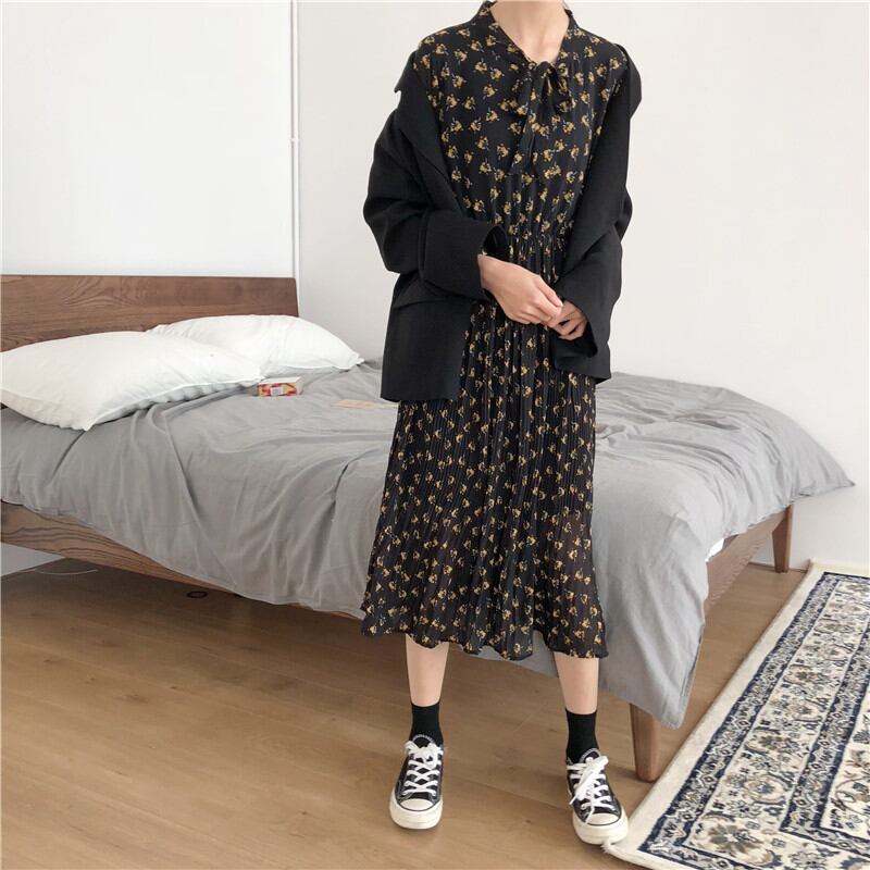 花柄 ワンピース 花柄ワンピース レトロ リボン ミモレ 長袖 デート 通勤