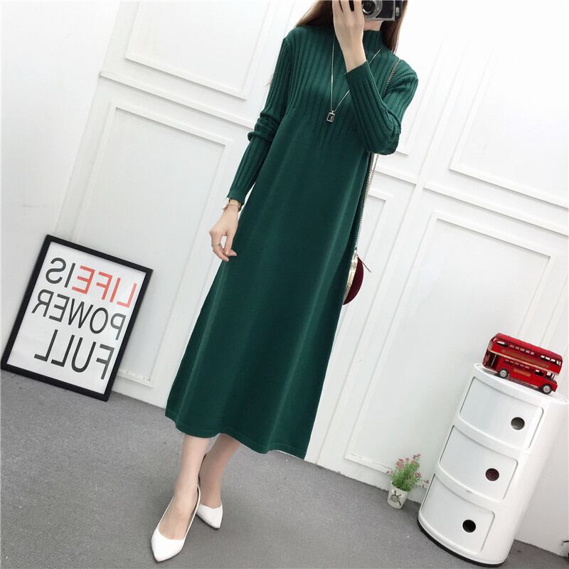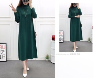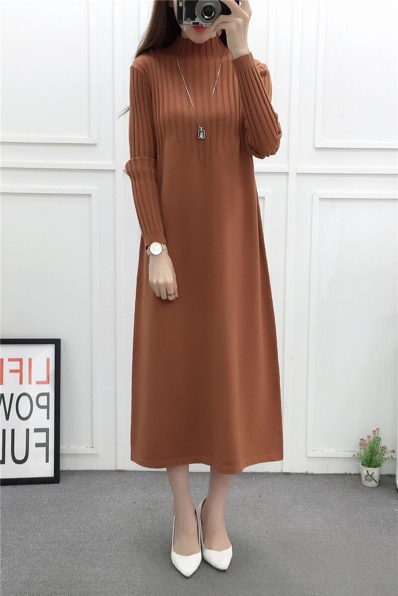 リブニットワンピース リブ ニット ワンピース ミモレ丈 フレア 長袖 ハイネック