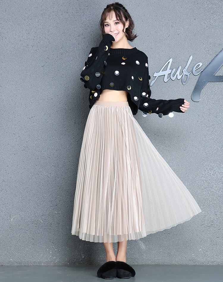 光沢プリーツの上からチュールをあしらった贅沢なスカート。