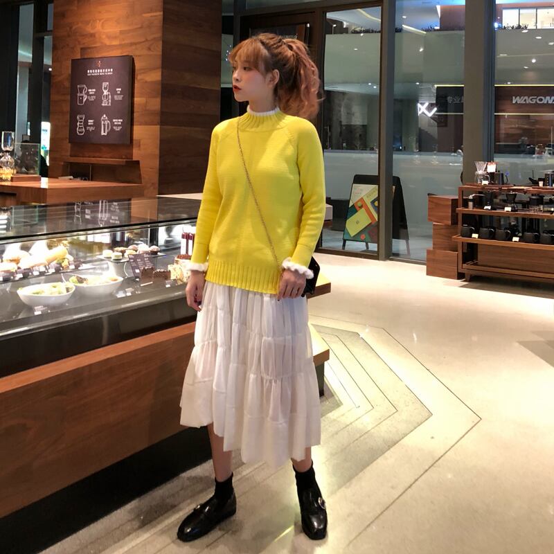 襟口と袖口にフリルで異なったカラーをあしらったニット。