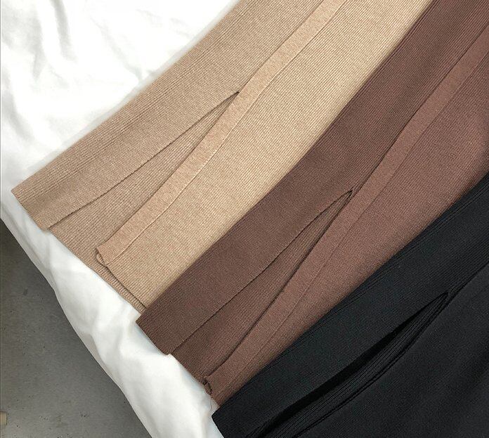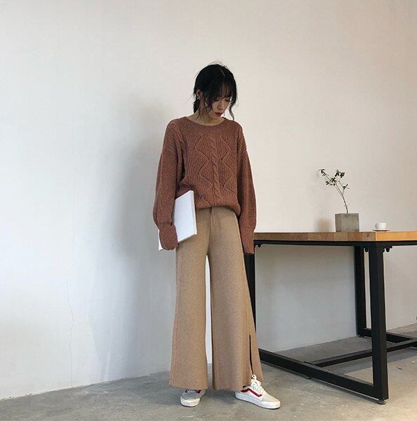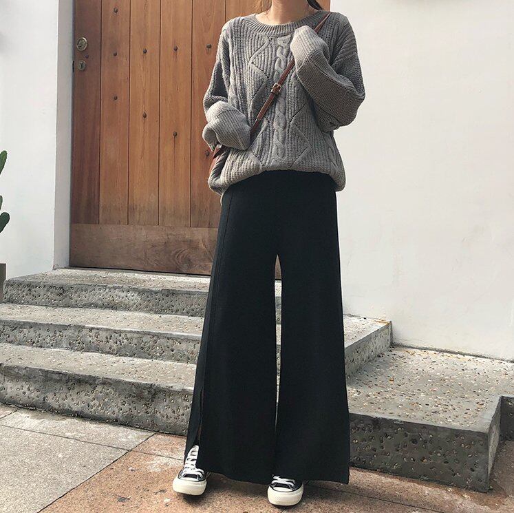 美脚 ワイド ニット パンツ カジュアル スリット ボトムス