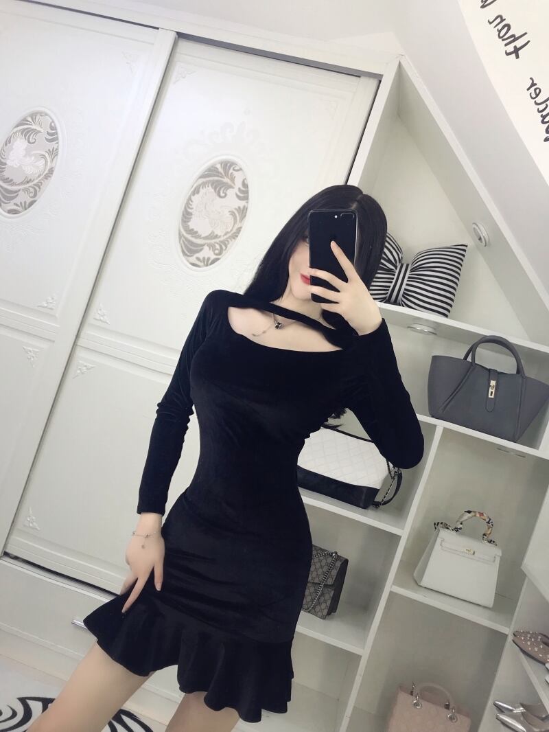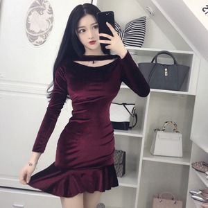 ベロア 裾フレア 首元穴あき ミニ丈 ワンピース フェミニンな雰囲気に☆ fsk0114