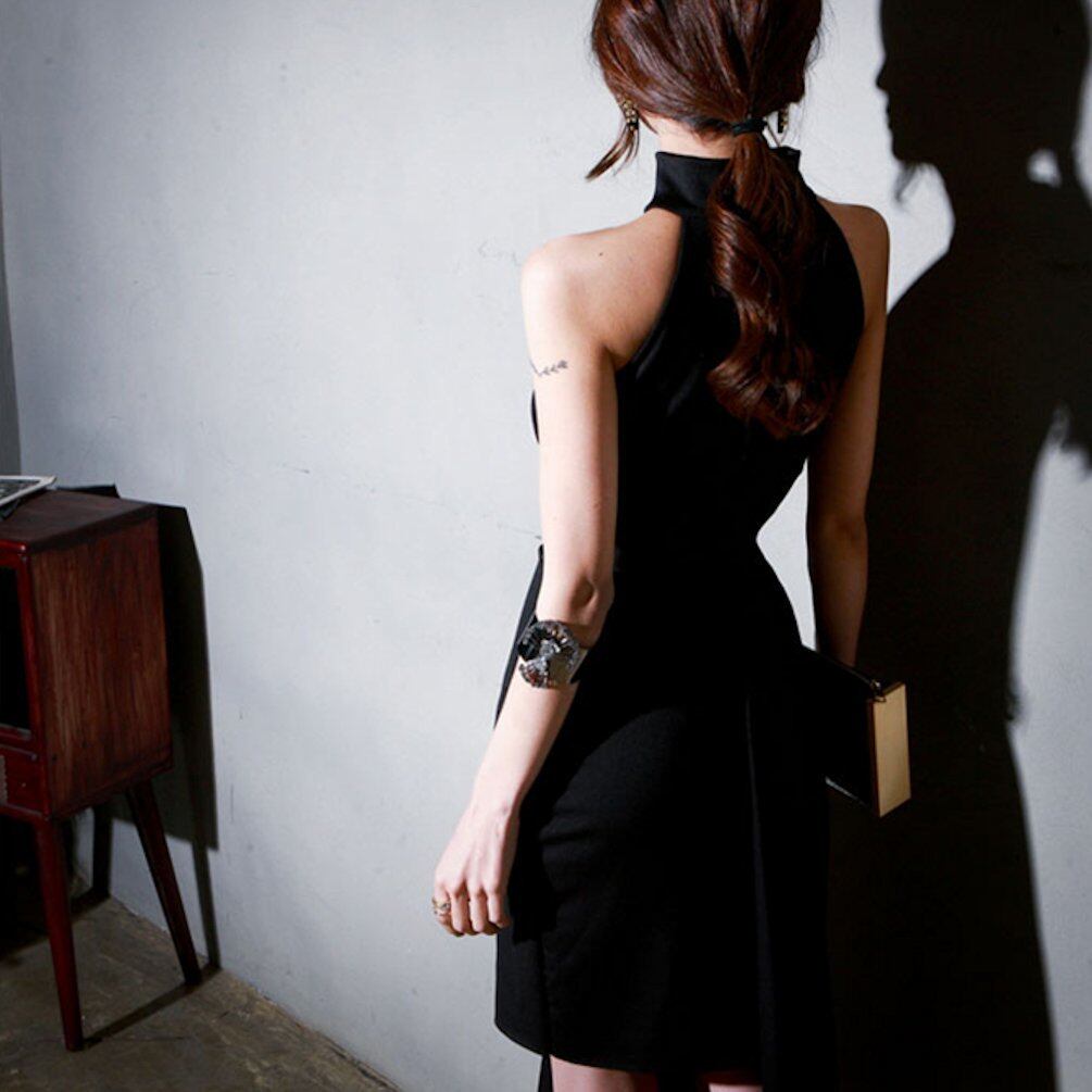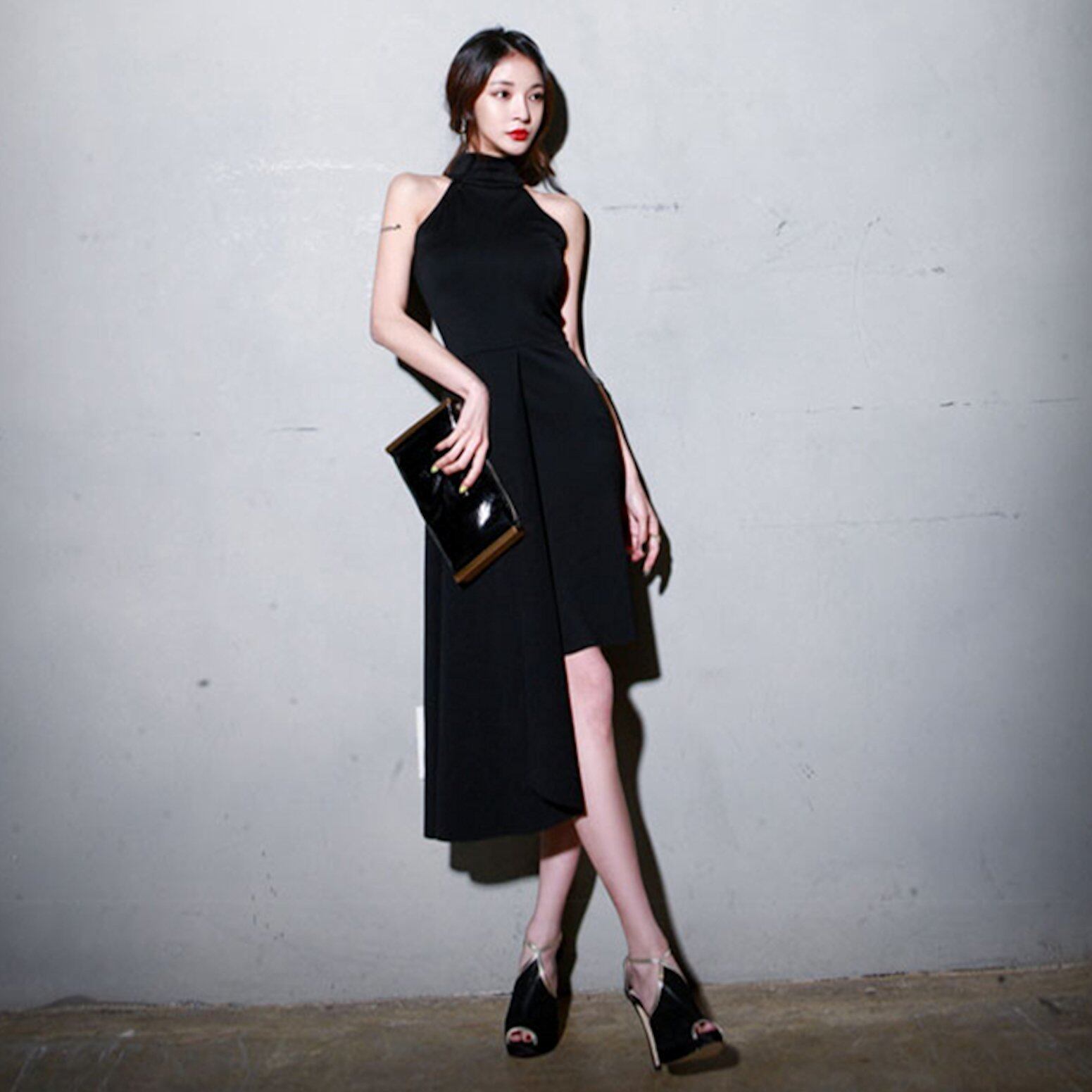 ホルタ―ネック ノースリーブ ワンピースドレス エレガント アシンメトリー ブラック お呼ばれ パーティー 披露宴 大人女子
