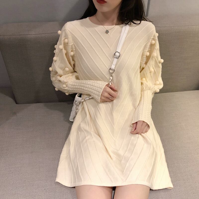 パフスリーブ ポンポンニットワンピース ミニ丈 フェミニン ルーズ