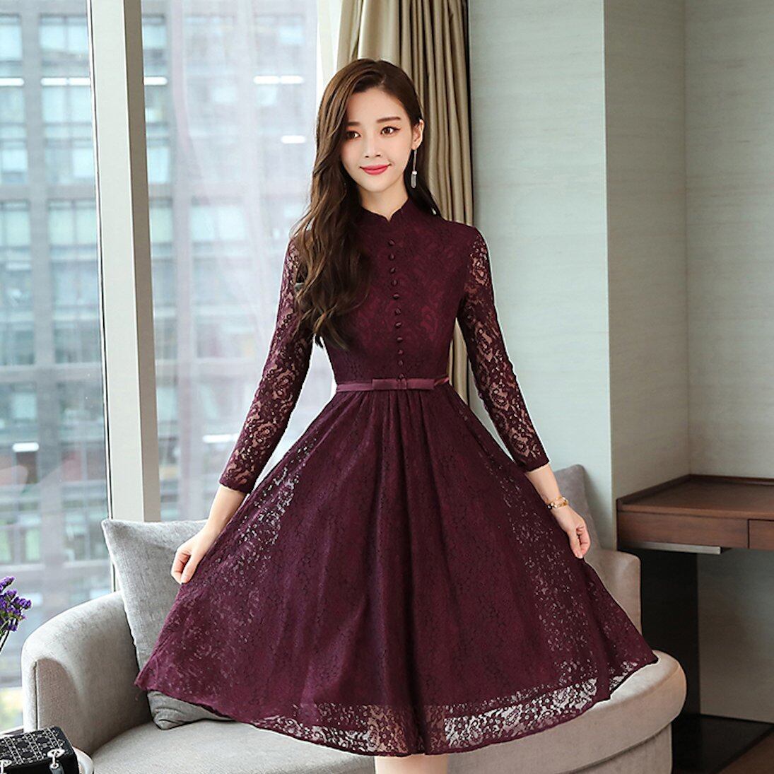 大人透け感 総レース 花柄 膝丈 フレア ワンピースドレス 華やかコーデに◎ fsk0168