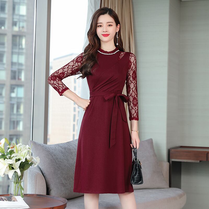 レース袖 ラウンドネック ウエストリボン ミモレ丈 ワンピースドレス お呼ばれコーデに◎ fsk0189