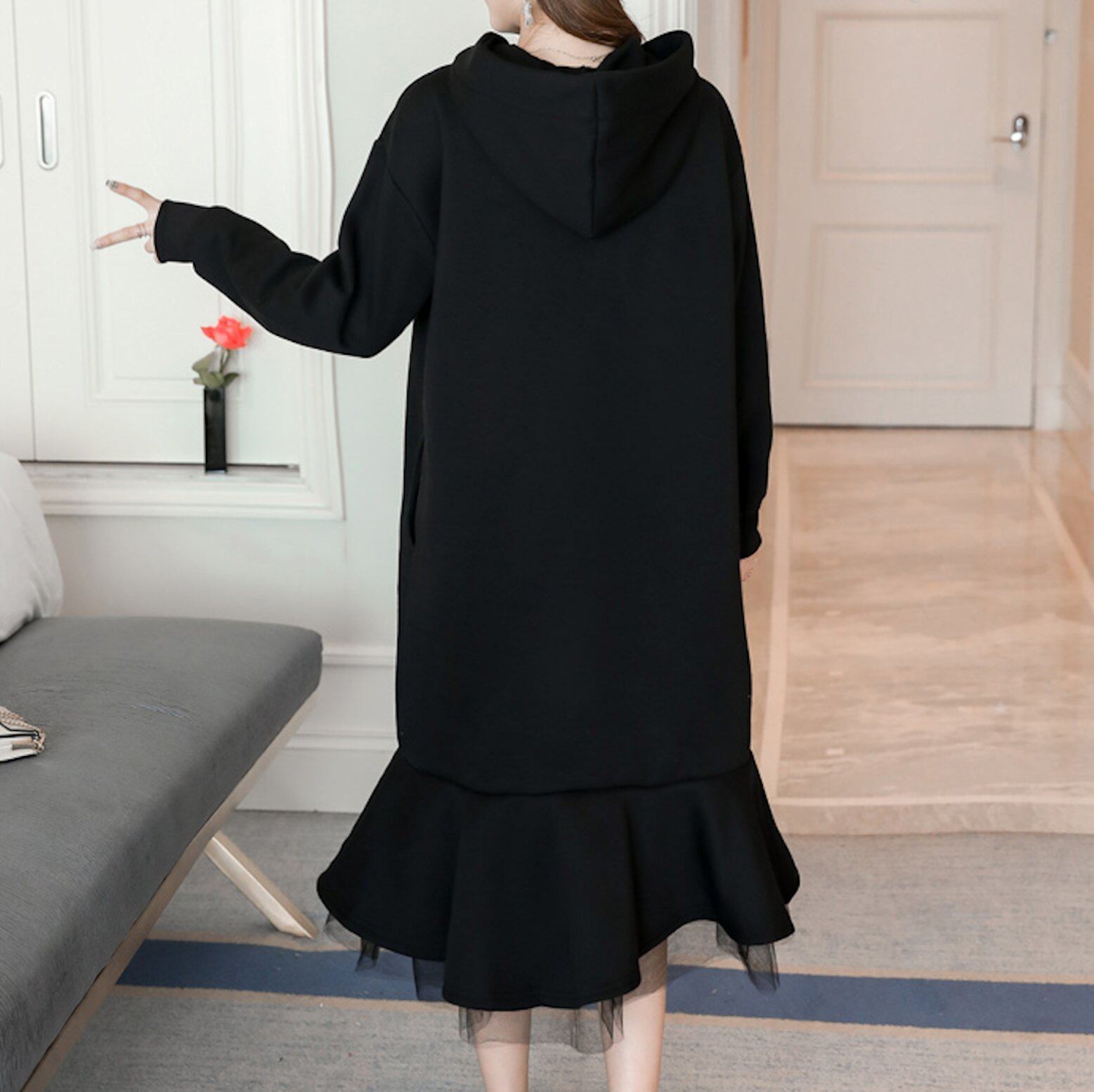 裏起毛 フード付 異素材 リボン フリル ロング ワンピース カジュアルコーデに◎ fsk0215