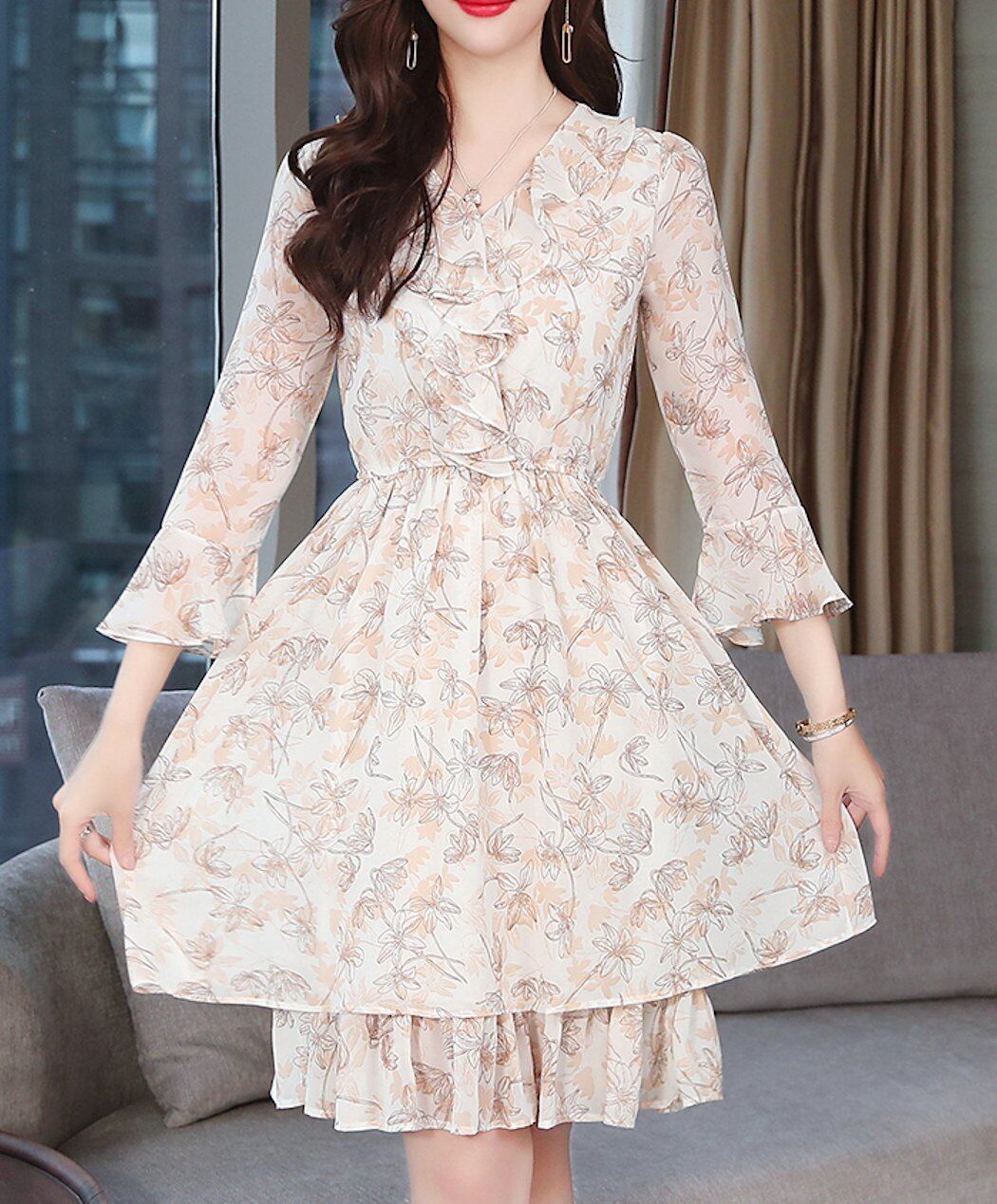 花柄 透け感 Vネック フレア袖 パステルカラー ワンピース ドレス きれいめ ガーリー フリル ミニ丈 膝上 お呼ばれ ニュアンスカラー 春