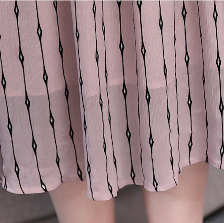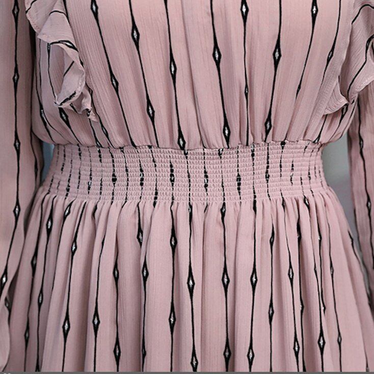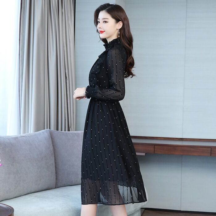 ストライプ柄風 ハイネック パフスリーブ フレア ワンピース ドレス シフォン 絞り ドット柄 透け感 シースルー パーティー お呼ばれ きれいめ