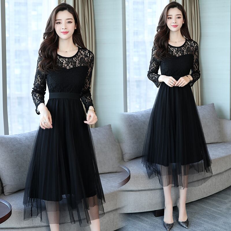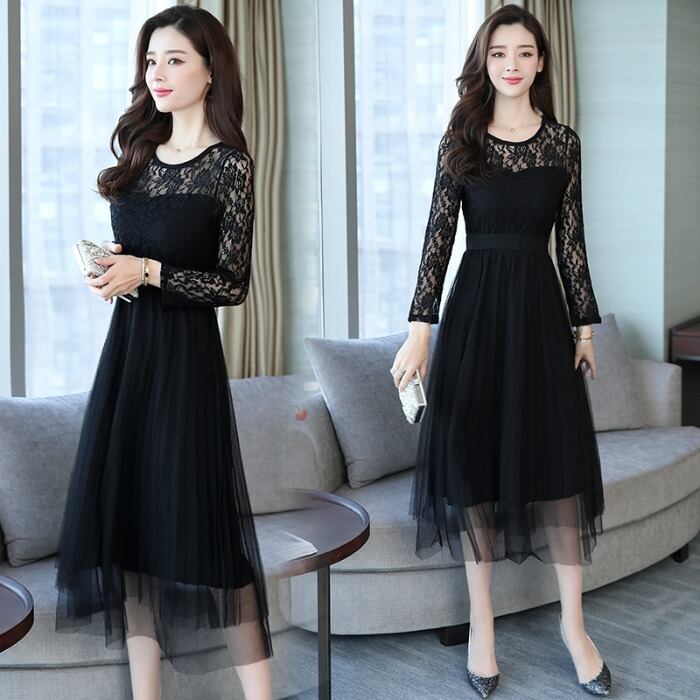 【送料無料】花柄 刺繍 レース 切替 メッシュ素材 ミモレ丈 ワンピース ドレス fsk0247