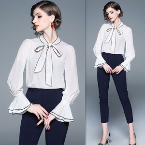 【送料無料】透け感 ブラウス 縁取り ネックリボン フレア袖 長袖 きれいめコーデに◎ fsk0253