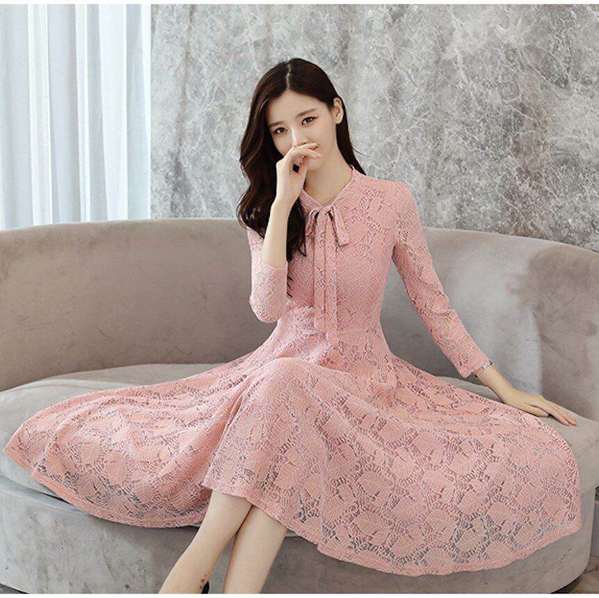 【送料無料】大人フェミニン リーフ柄 レース ミモレ丈 ワンピース ネック リボン 春 お呼ばれ fsk0278