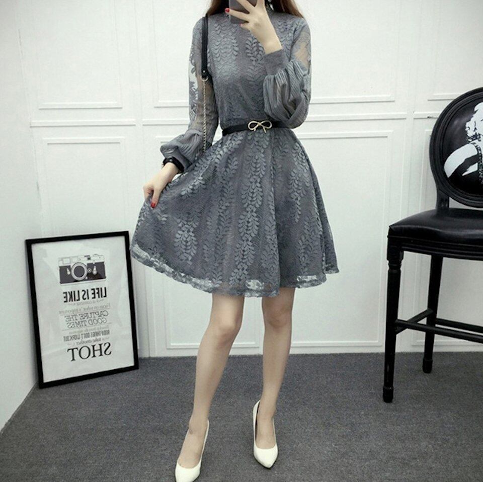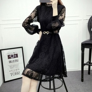 【送料無料】レース ワンピース 30代 レトロ パフスリーブ ハイネック リボンベルト フェミニン fsk0282