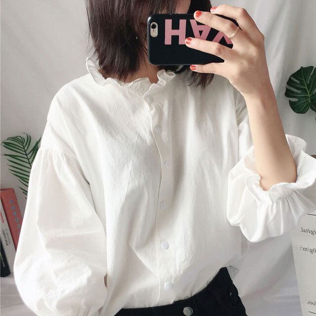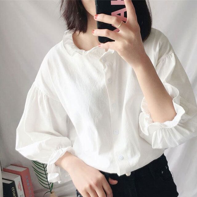 【送料無料】ネックフリル 長袖ブラウス バールン袖 コットンフリルブラウス fsk0334