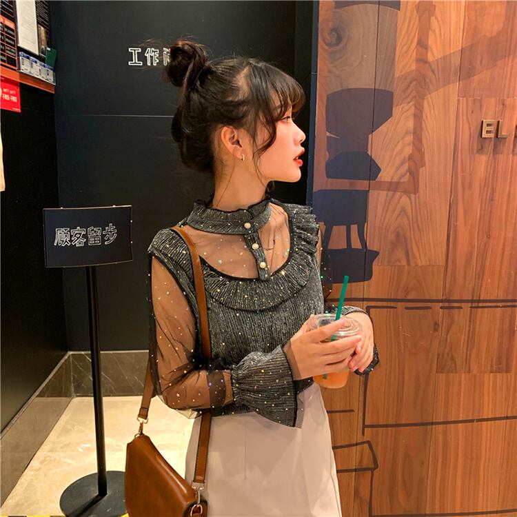 シースルー袖 ベルスリーブ ラメ 長袖シャツ パフスリーブ フリル fsk0349