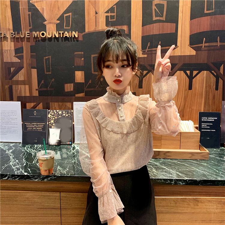 シースルー袖 ベルスリーブ ブラウス ハーフハイネック シースルー 10代 20代 30代 40代