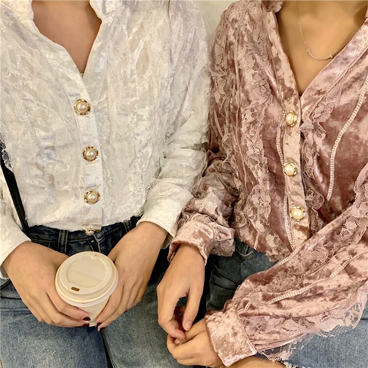 フリルレース ベルベット ブラウス パールボタン シャツ フェミニン 春物