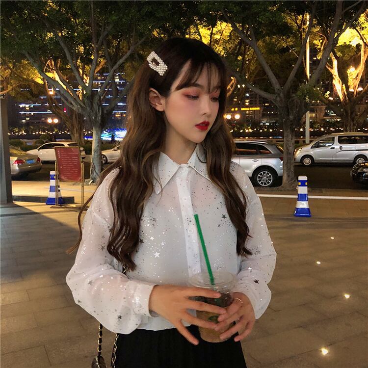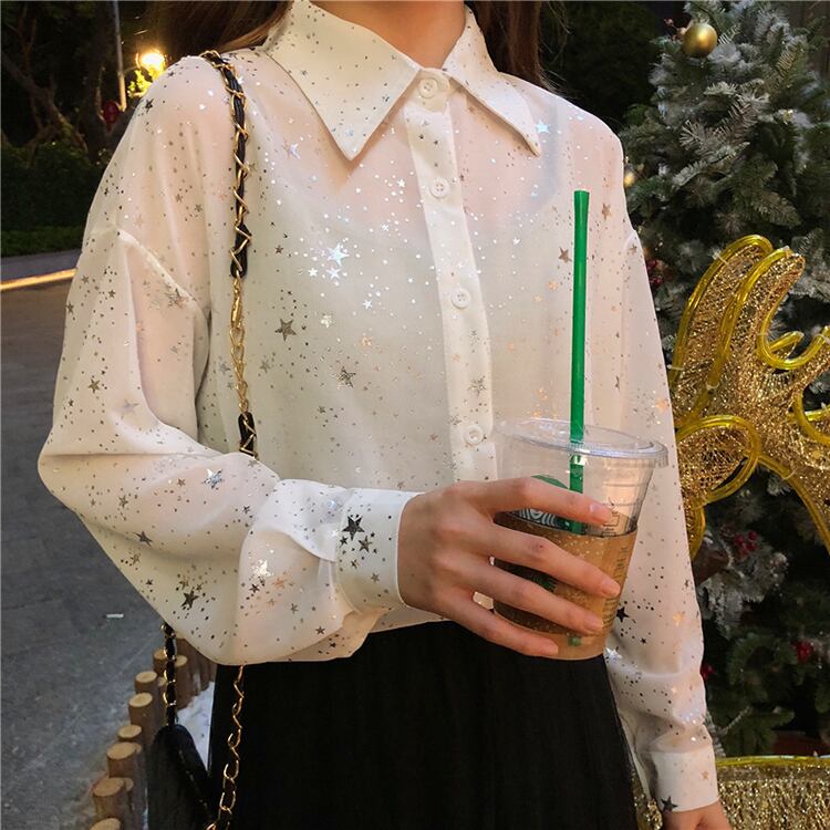 星柄 シャツ ブラウス 箔プリント ゆったり 長袖 ブラック 大人可愛い☆fsk0351