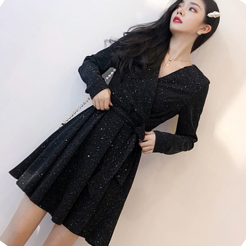 ワンピース Vネック ウエストリボン ミニ キラキラ ラブリー 長袖 きれいめ☆fsk0384