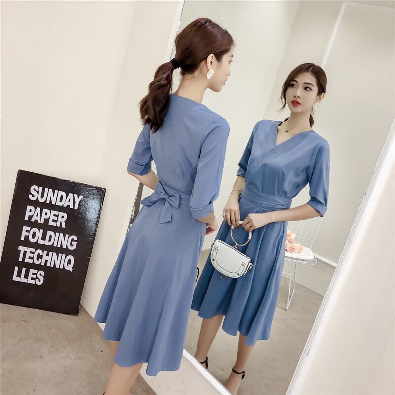 フレアワンピース 大人スタイル ふんわり カシュクール 2色 エレガント ミモレ丈 無地 ☆fsk0382