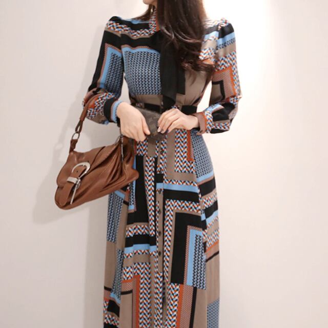 ングワンピース 長袖 リボンタイ ロングワンピ 前開きワンピース 大人かわいい 30代