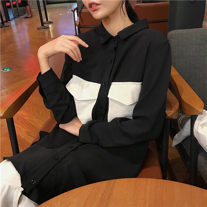 重ね着風 長袖ロングワンピース シャツワンピース ブラウス フィッシュテールスカート フレア fsk0371