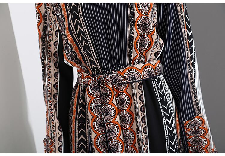 【送料無料】ワンピース 長袖 ロング丈 ボヘミアン風 スタンドカラー ベルト付き 通勤☆fsk0428