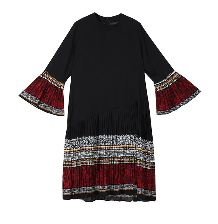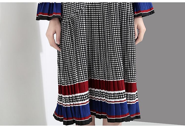 ワンピース 長袖 ひざ下丈 ドットトランペットスリーブ スタンドカラー トリコロール プリーツ