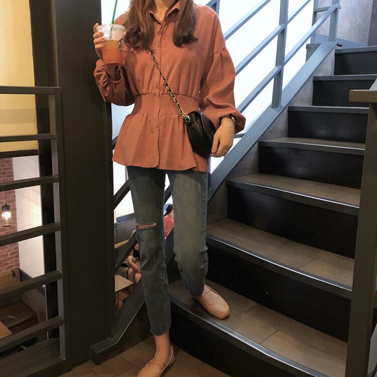 ウエストゴム入り ボリューム袖 ブラウス ブレストウエスト ボリューム袖 長袖ブラウス レトロシャツ fsk0403