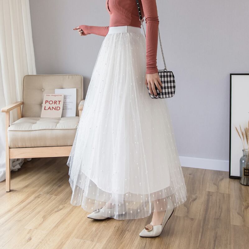 メッシュロングスカート プリーツスカート チュールスカート ビーズ fsk0461