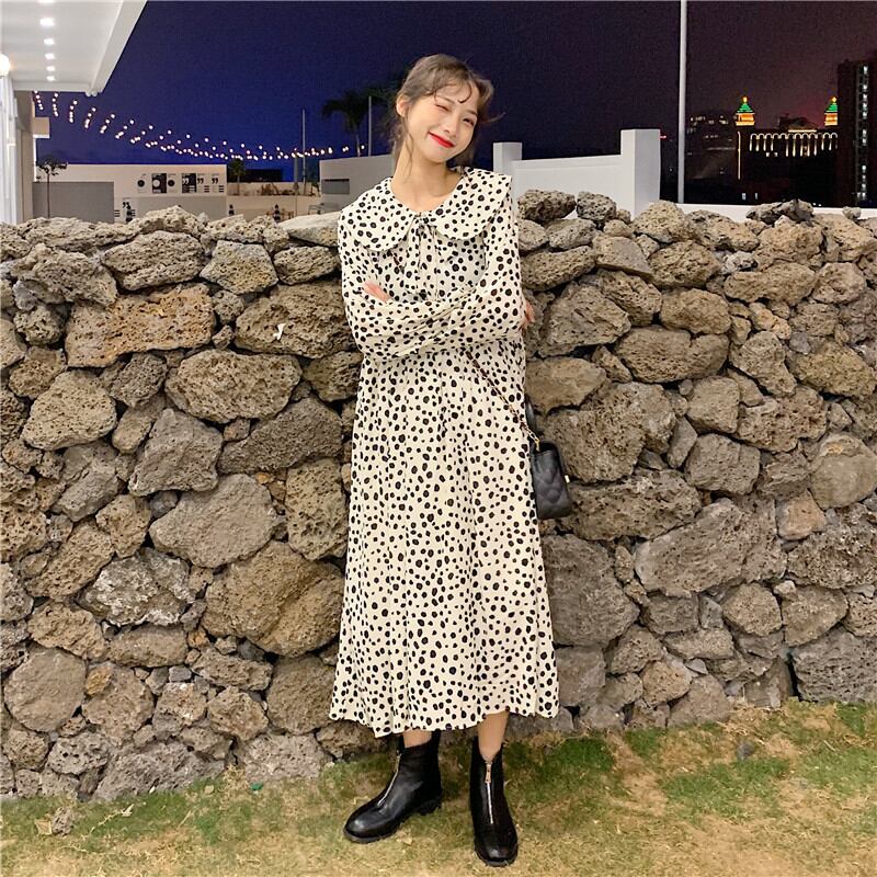 ワンピース 長袖 ミモレ丈 キュート ゆったり デート リボンタイ ナチュラル服 アニマル柄