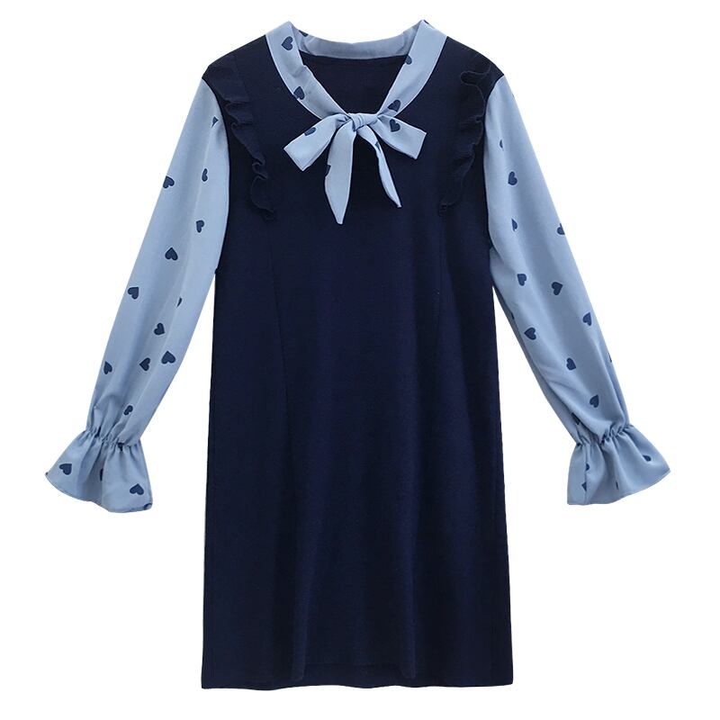 ワンピース 長袖 膝丈 キュート ボウタイ ハート柄 フリル袖 かわいい