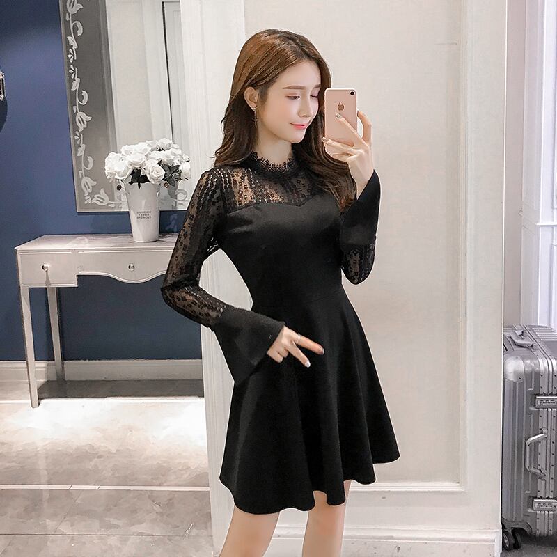 ワンピース 長袖 ミニ丈 フレア レース シースルー 透け感 Aライン フレア袖