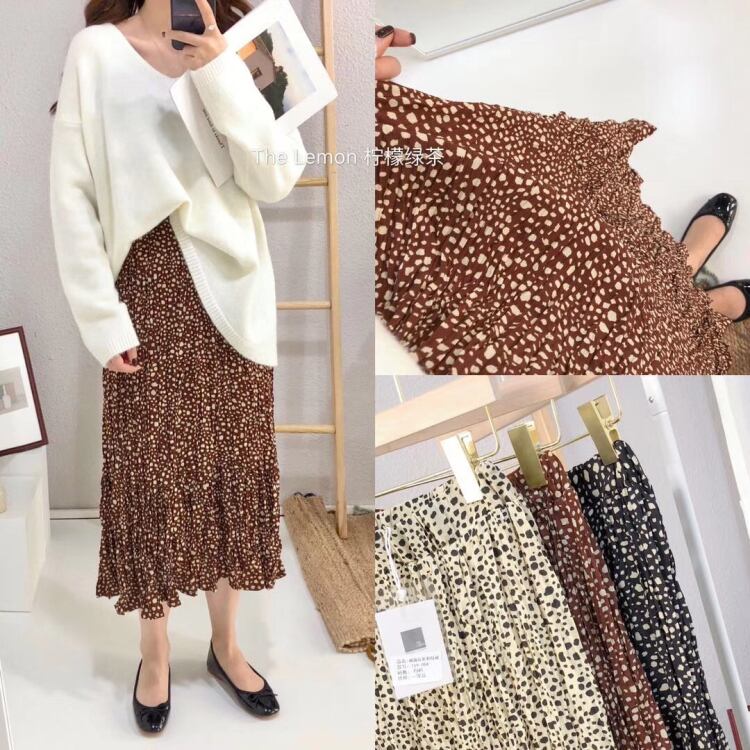 レトロプリーツ ポルカドット レオパード柄ロングスカート fsk0564