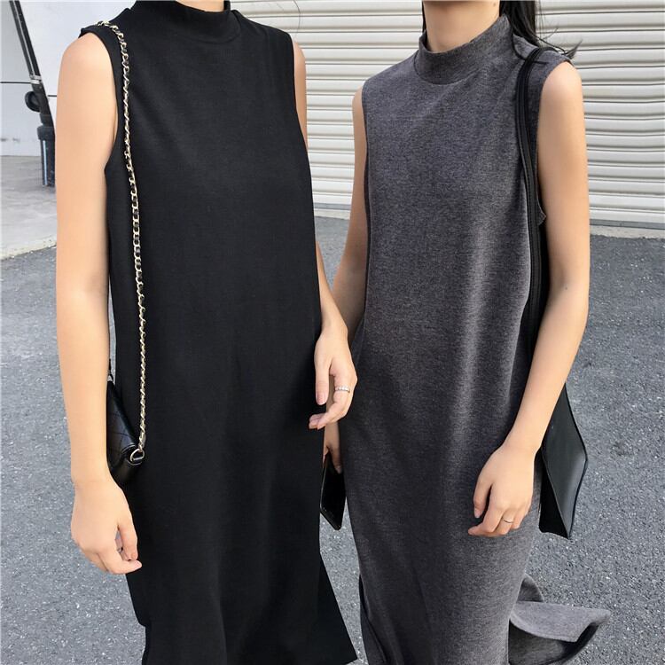ワンピース ミモレ丈 スタンドカラー ノースリーブ 無地 Iライン 体型カバー スリット シンプル きれいめ 春夏 お出かけ デート☆fsk0615