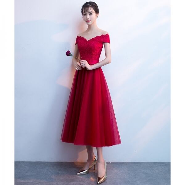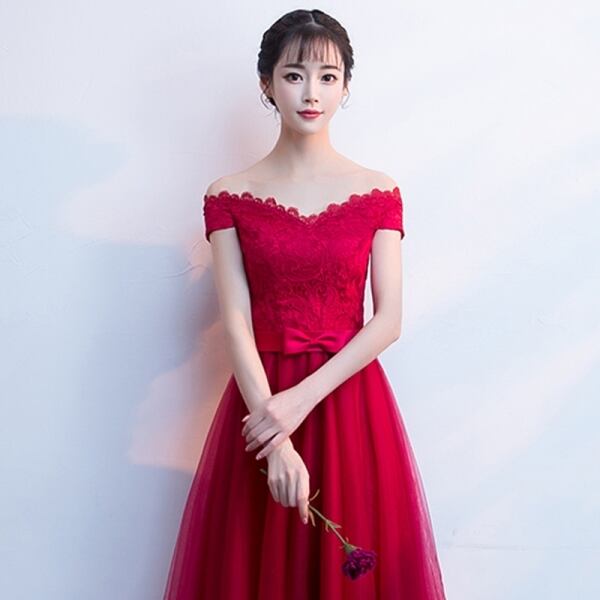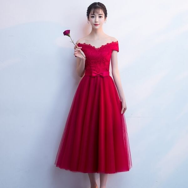 パーティードレス ワンピース オフショルダー レース ウエストリボン シフォン ミモレ丈 チュールスカート お呼ばれ 謝恩会 フェミニン