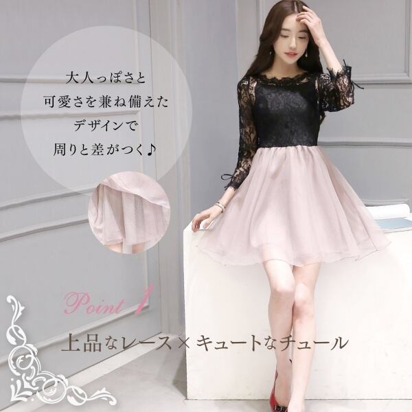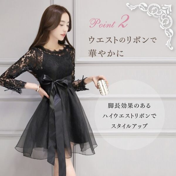 パーティードレス ワンピース ミニドレス レース チュール 透け感 大人可愛い ガーリー 結婚式 二次会 お呼ばれ 刺繍 ブラック 袖あり
