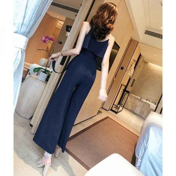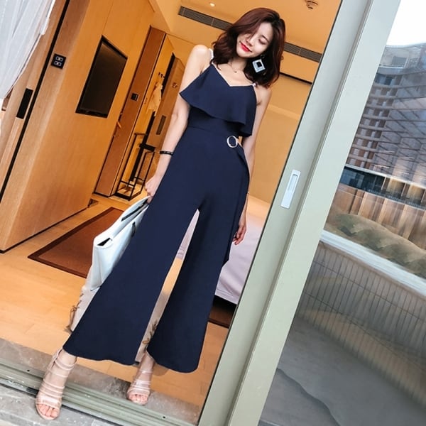 パーティードレス オールインワン キャミソール パール バストフリル セクシー シンプル ハイウエスト ネイビー 無地 結婚式 お呼ばれ ワイドパンツ