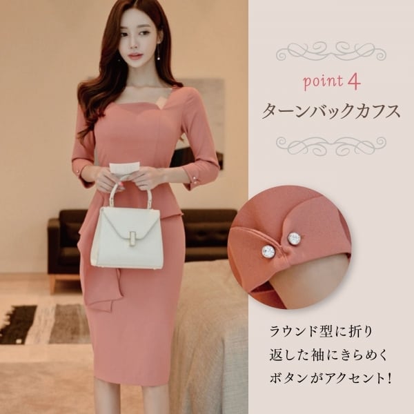 パーティードレス タイトワンピース ピンク フリル ウエストマーク スクエアネック 七分袖 ターンバックカフス ひざ丈 袖あり セクシー エレガント 結婚式 お呼ばれ