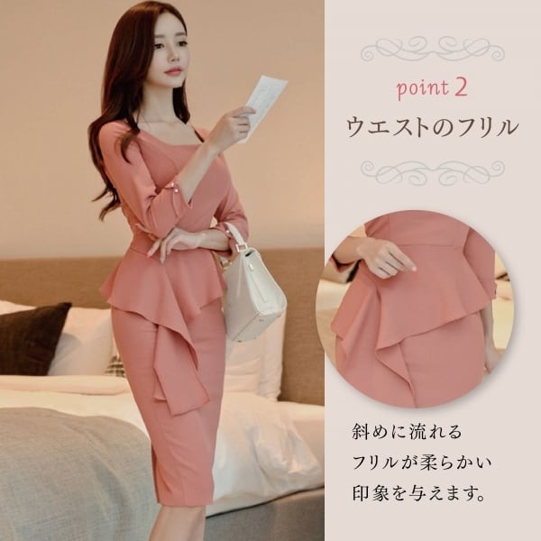 明るいピンクがかっちり感に優しさをプラスしてくれるワンピースのご紹介です。斜めに流れるフリルが柔らかい印象を与え女性らしいエレガントさを演出してくれます。スクエアネックで首を長く見せ鎖骨も綺麗に見せてくれます。結婚式、二次会などのパーティーシーン、お呼ばれなどのきちんとシーンにおススメです。