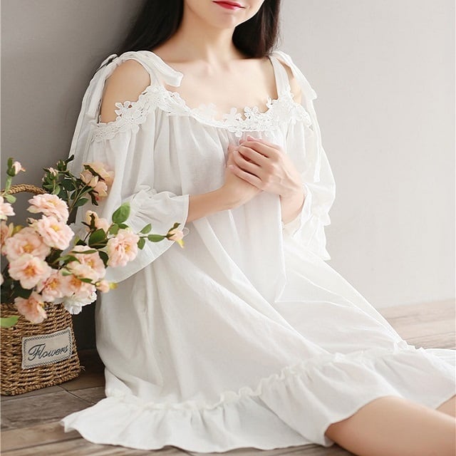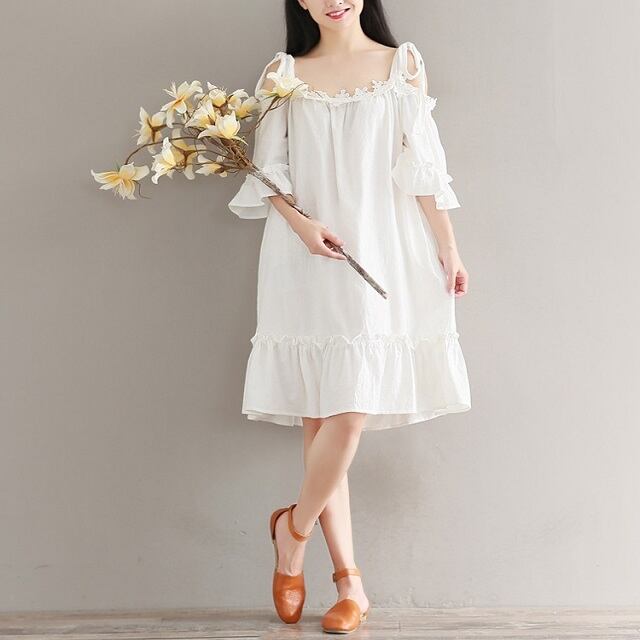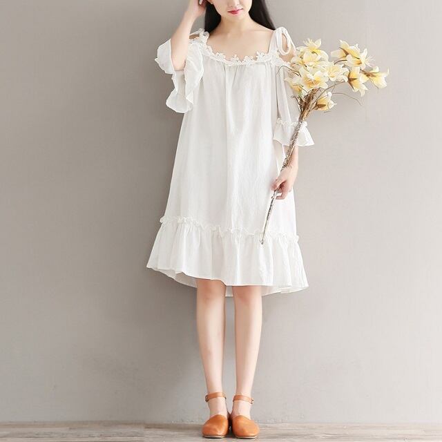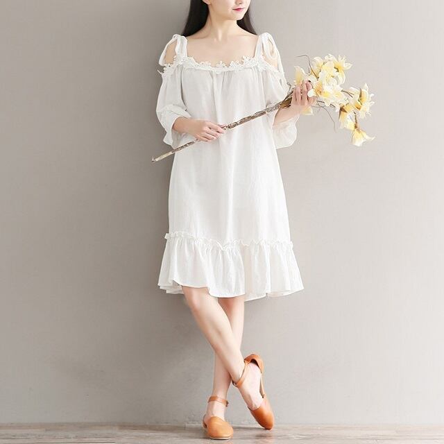 ワンピース シフォンワンピース コットン ショルダーリボン 袖フリル フレア 花ポイント 肩見せ 七分袖 ひざ丈 フェミニン ガーリー ホワイト 春夏 お出かけ デート