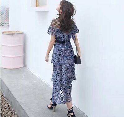 ドレス ワンピース 総レース ひざ下丈 ラウンドネック 半袖 花刺繍 Xライン 刺繍 透け感 袖あり エレガント 春夏 お呼ばれ 発表会 ドレスワンピ fsk0622