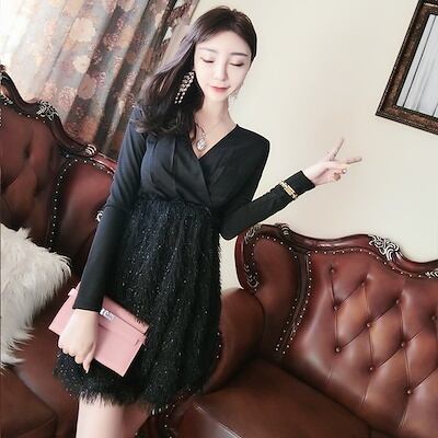 ドレス ワンピース ミニ丈 Vネック 長袖 無地 ステッチ 大人可愛い セクシー 春夏 二次会 お呼ばれ 女子会 ドレスワンピ 黒 fsk0606