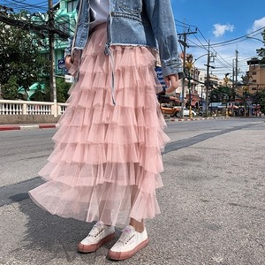 マキシ丈 スカート ロング丈 無地 チュール レイヤード ハイウエスト フリル カジュアル 大人可愛い 夏 20代 30代 ガーリー fsk0758