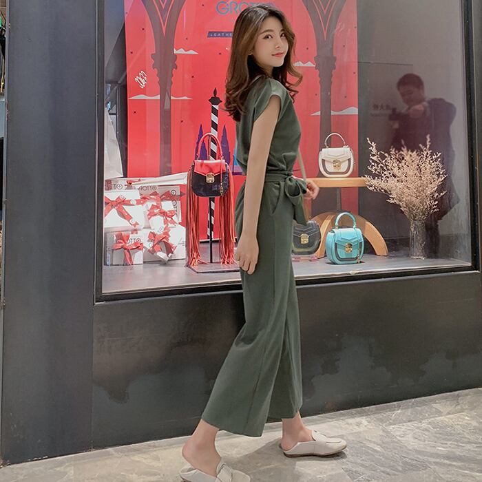 セットアップ フレンチスリーブ 半袖 リボン ウエストマーク ワイドパンツ 無地 シンプル 大人可愛い カジュアル 夏 20代 30代