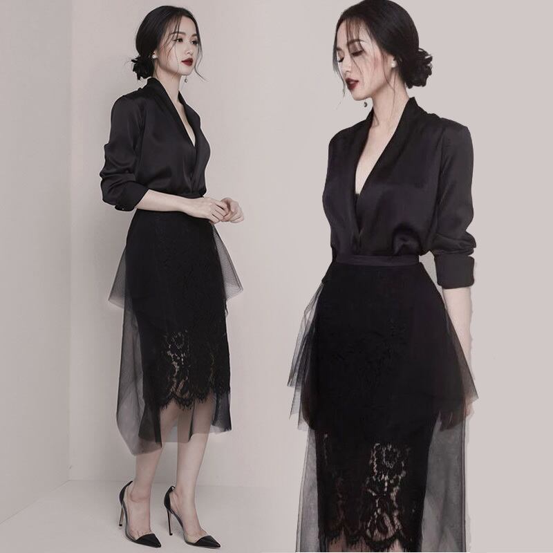 セットアップ Vネック 七分袖 スカート チュール レース ハイウエスト ひざ丈 お呼ばれ 二次会 無地 エレガント きれいめ