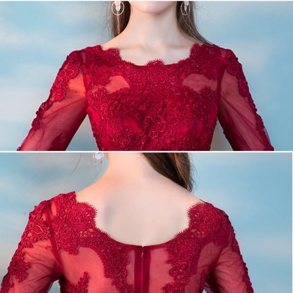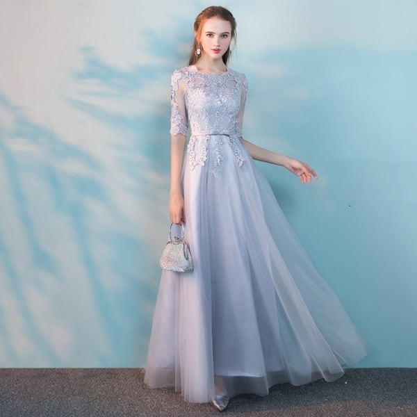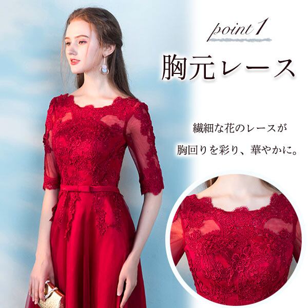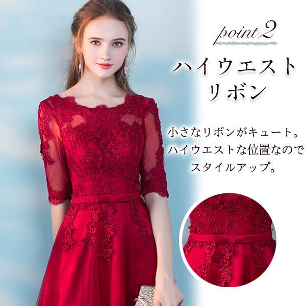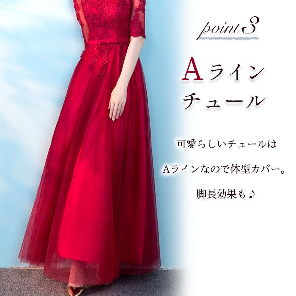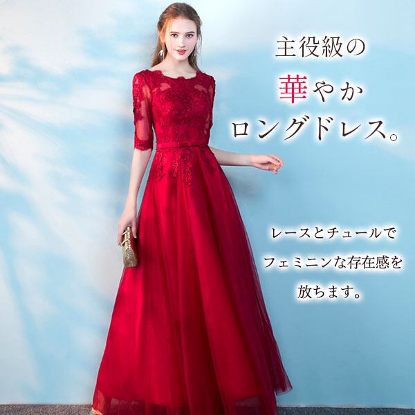 ロングドレス パーティードレス 結婚式 二次会 ワンピース ドレス お呼ばれ 20代 30代 40代 五分袖 レース チュール リボン Aライン