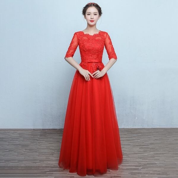 ロングドレス パーティードレス 結婚式 二次会 ワンピース ドレス お呼ばれ 20代 30代 40代 五分袖 レース チュール リボン Aライン fk0858